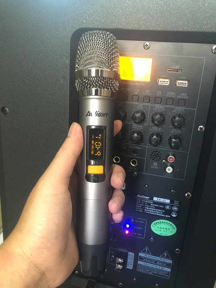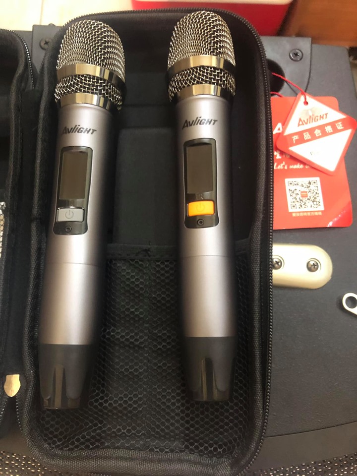 Cặp micro không dây của loa kéo avlight EX 12 được thiết kế nhỏ gọn, vừa tay được phủ một lớp sơn bóng bên ngoài, tên thương hiệu avlight được in trên micro. Cặp micro có khả năng bắt âm tốt, không bị chập chờn, cho âm thanh chân thực.
