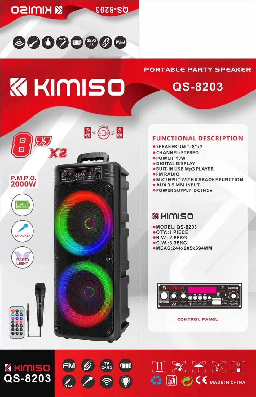 Loa Kéo Di Động Karaoke KIMISO QS-8203 (Bass đôi 8x2, 1 Micro có dây) Liên hệ Số lượng :