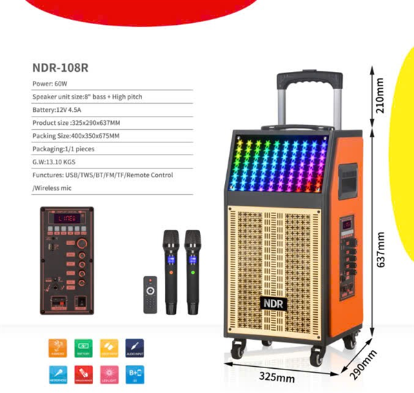 Loa Kéo Karaoke NDR-108R (Bass 8", 2 Micro không dây)