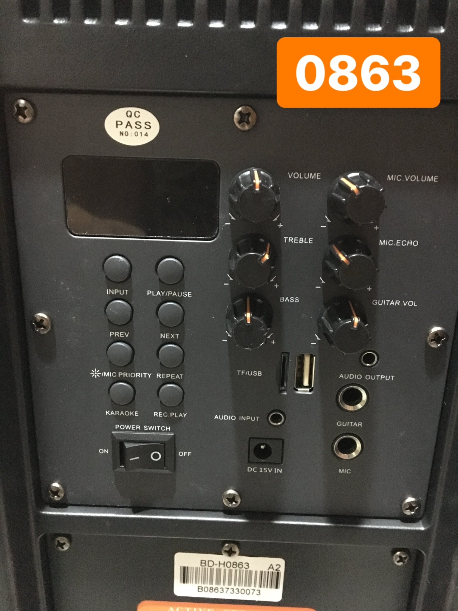 Bảng điều khiển của loa được tích hợp ở mặt sau, với đầy đủ những phím tắt và phím điều khiển. Nhìn vào trung tâm, bạn sẽ thấy ngay một màng hình đèn led, nó sẽ giúp bạn theo dõi những hoạt động mà loa đang hiện hành. Kế đó là các phím chỉnh khi dùng ở chế độ USB/SD, chuyển chế độ và nút chỉnh tắt âm người hát để biến những bài hát thành version karaoke, một chức năng thường ở những dòng loa cao cấp mới có.